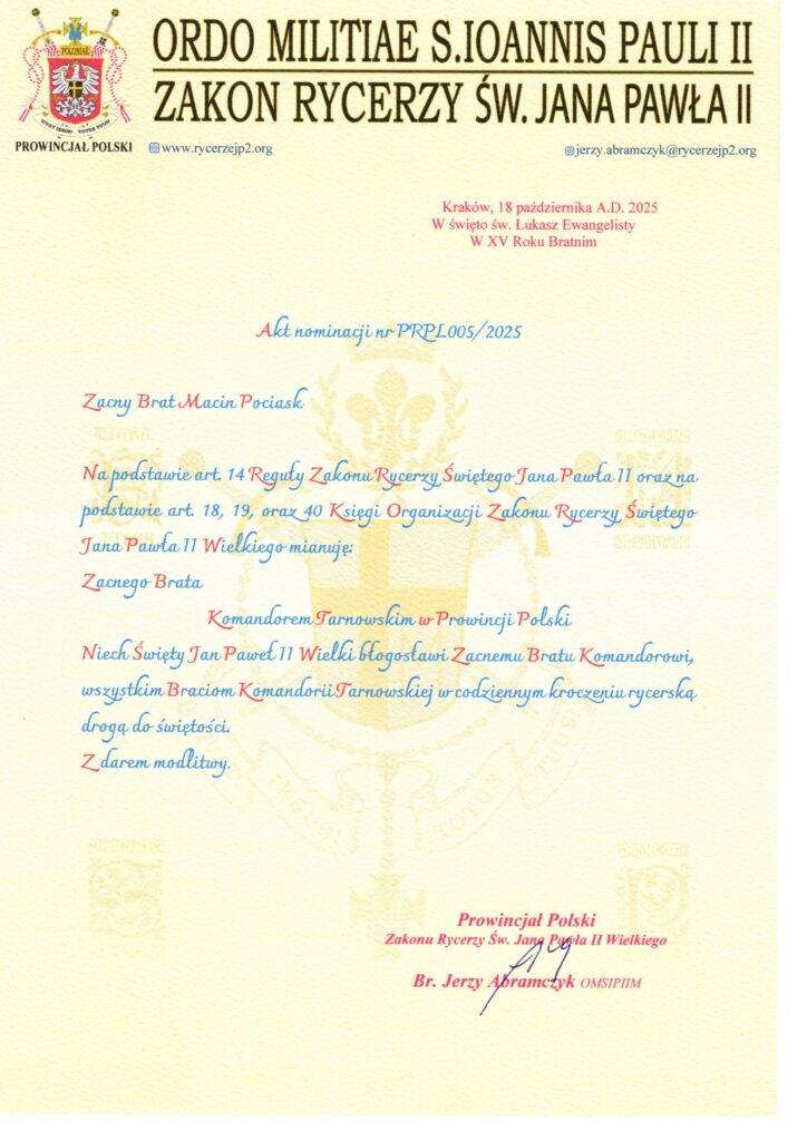 Jego następcą – czyli drugim w historii Komandorem Tarnowskim został dzisiaj mianowany ZB Marcin Pociask, Wielki Rycerz naszej Chorągwi. Serdecznie gratulujemy ZB Komandorowi Marcinowi POCIASK