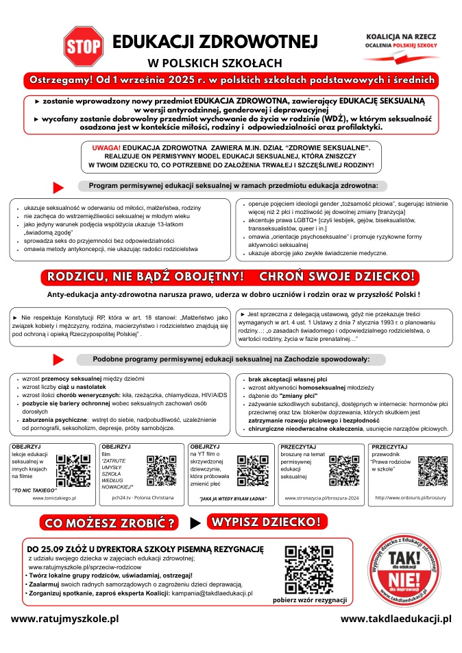 Drodzy Rodzice! Przyszłość dzieci jest w Waszych rękach. Pamiętajcie, że jesteście w sumieniu przed Bogiem odpowiedzialni za ich prawidłowe wychowanie. Nie wolno Wam zgodzić się na systemową deprawację Waszych dzieci, która ma być prowadzona pod pretekstem tzw. edukacji zdrowotnej. W trosce o wychowanie i zbawienie, apelujemy, abyście nie wyrażali zgody na udział Waszych dzieci w tych demoralizujących zajęciach.