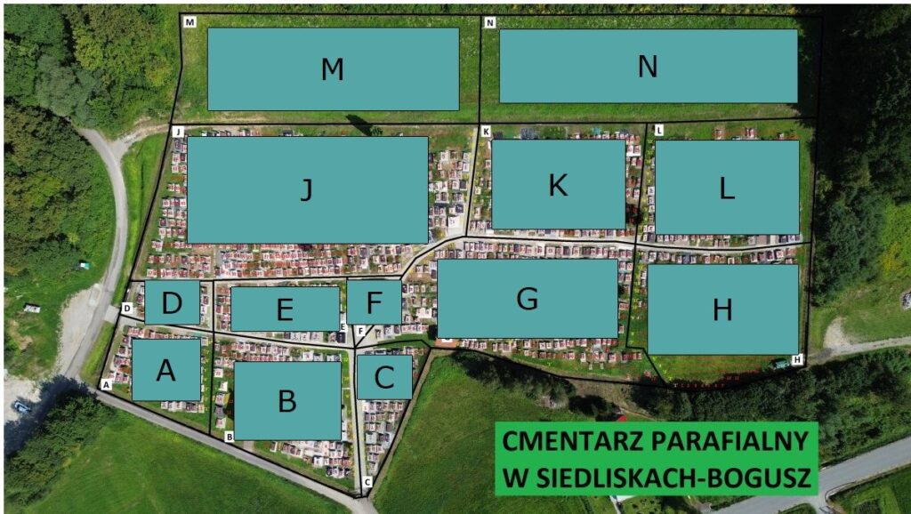 Firma KANCELARIA ARCHIWISTYCZNA G&T zakończyła tworzenie bazy danych Cmentarza parafialnego w Siedliskach – Bogusz do programu FARA 5.0. Cmentarz został podzielony na sektory według planu poniżej. Każdemu nagrobkowi została nadana numeracja. Parafia posiada wersję drukowaną (4 Księgi) i elektroniczną cmentarza. Na stronie parafialnej w ZAKŁADCE CMENTARZ można sprawdzić i odszukać groby swoich bliskich zmarłych pochowanych na cmentarzu w Siedliskach i sprawdzić dane. Gdyby w bazie danych cmentarza pojawiły się błędy (najczęściej literówki wynikające ze złej jakości tablic cmentarnych lub charakteru pisma – to proszę o korektę na maila alelito@op,pl, którą naniosę do programu fara.